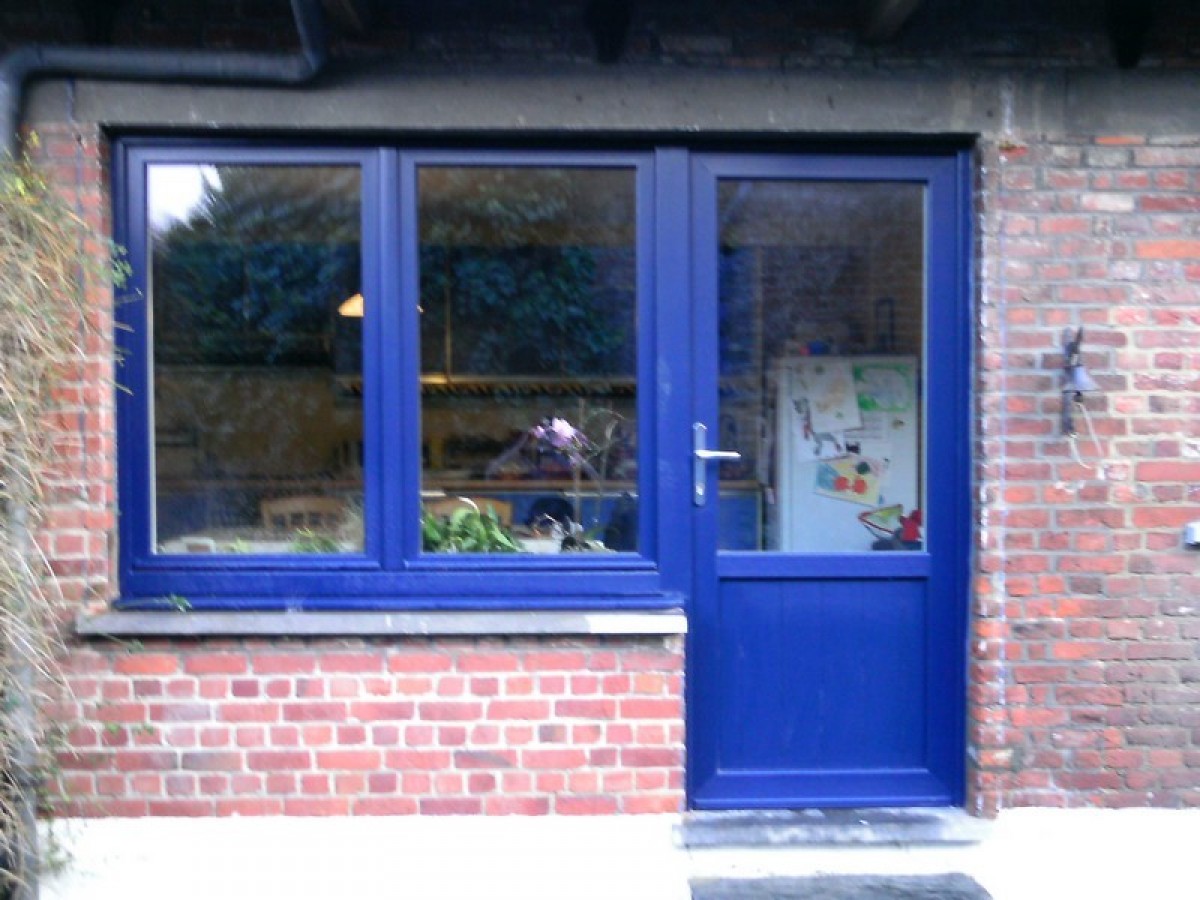 Pour la baie vitrée, il y avait un châssis avant.Nous avons ouvert jusqu'en bas, posé la pierre bleue, recarrelé et remaçonné les tête de mur.